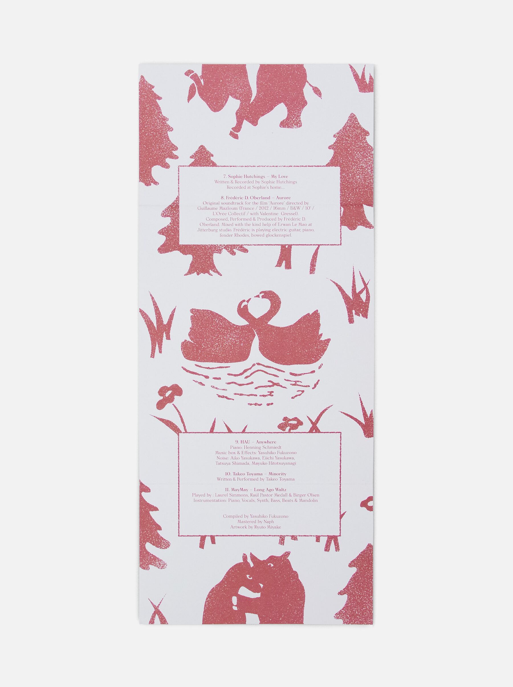三拍子のステップと柔らかく揺れるドレープが描く弧。フロアに描かれた小さな弧が、時間をかけて、ひとつ、またひとつとつながって生まれた、豊かに広がるサークルの軌跡。flauレーベル所属アーティストを含め、世界中のアーティストとの直接の交渉を経て、ワルツをテーマに奏でられた楽曲全11曲が収録。それぞれが個性を持っていながらも、レーベル10周年の、これまでの積み重ねを経て築かれたレーベルの柔軟さと、変わらない頑固な芯の部分が伝わってくるような、素晴らしい作品集。折り方によってワルツを踊る動物達の様々な表情が楽しめる特殊紙ジャケット仕様。